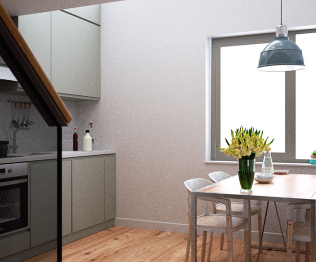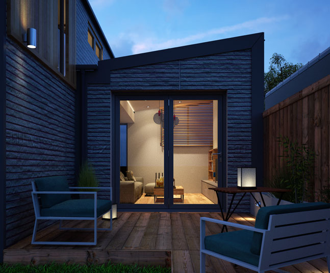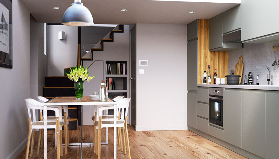 thezepto is our most popular model of ‘micro-home’, taking the yocto concept house to the next level in terms of facility and comfort. the zepto is our second smallest home, however comes complete with fully kitchen/diner/lounge, traditional (compact) stairs, a full double bedroom with TV area and fitted wardrobes, as well as a dedicated study/dressing area with window overlooking the rear garden. The integrated refuse and cycle storage at the rear complete the picture of the UK’s most complete, most compact, affordable house.